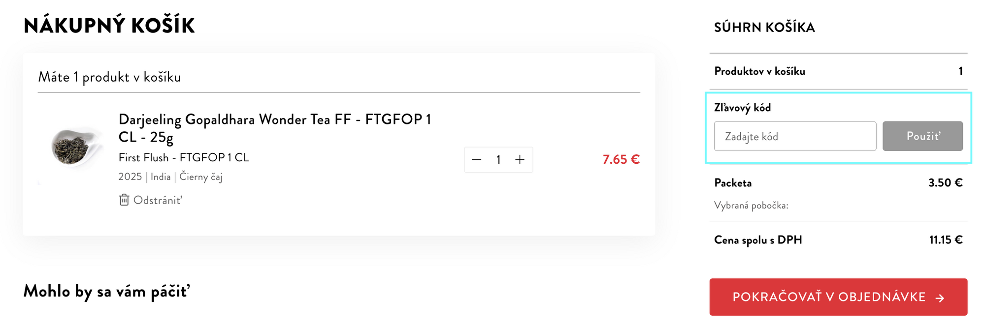 3. Po zobrazení Nákupného košíka sa Vám zobrazí Súhrn košíka a pod nim políčko Zľavový kód